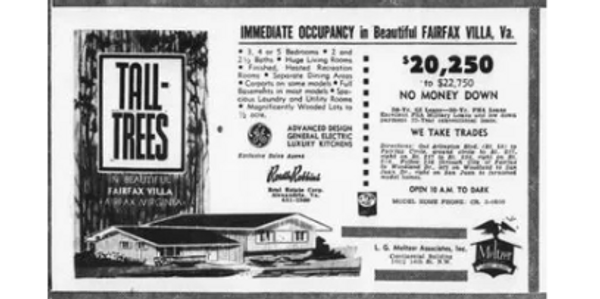 L.G. Meltzer & Associates of Washington, DC. purchased the Fairfax Villa Subdivision land in 1959. The subdivision has 423 lots and was built in five sections. Many of the street names in the villa are also found in Vista, California.